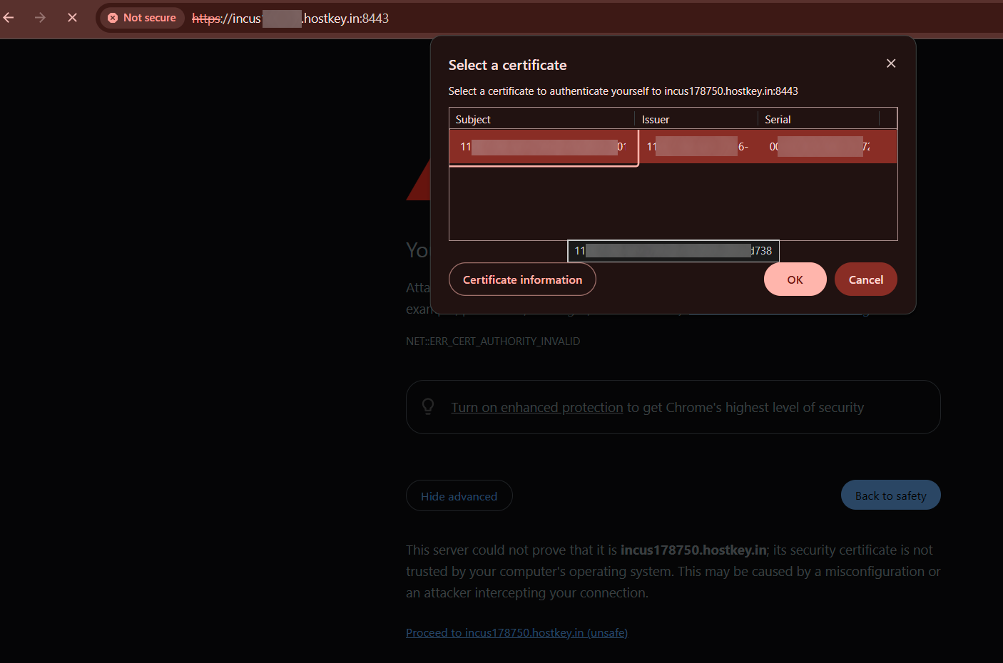 Lors de la première connexion à l'interface web d'Incus, le navigateur avertira d'une connexion non sécurisée en raison du certificat auto-signé. Il est nécessaire d'accepter le certificat pour continuer :