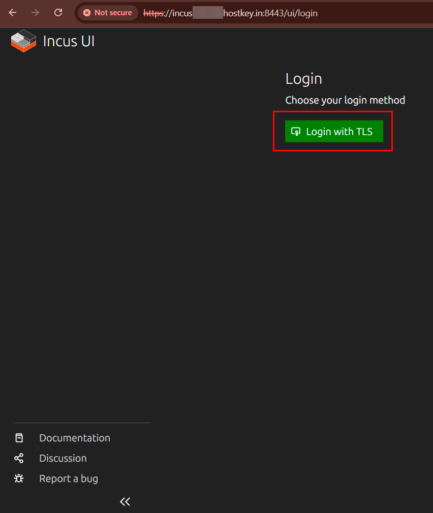 Après avoir accepté le certificat, la page de connexion s'ouvrira. Cliquez sur le bouton Login with TLS pour démarrer le processus d'authentification :