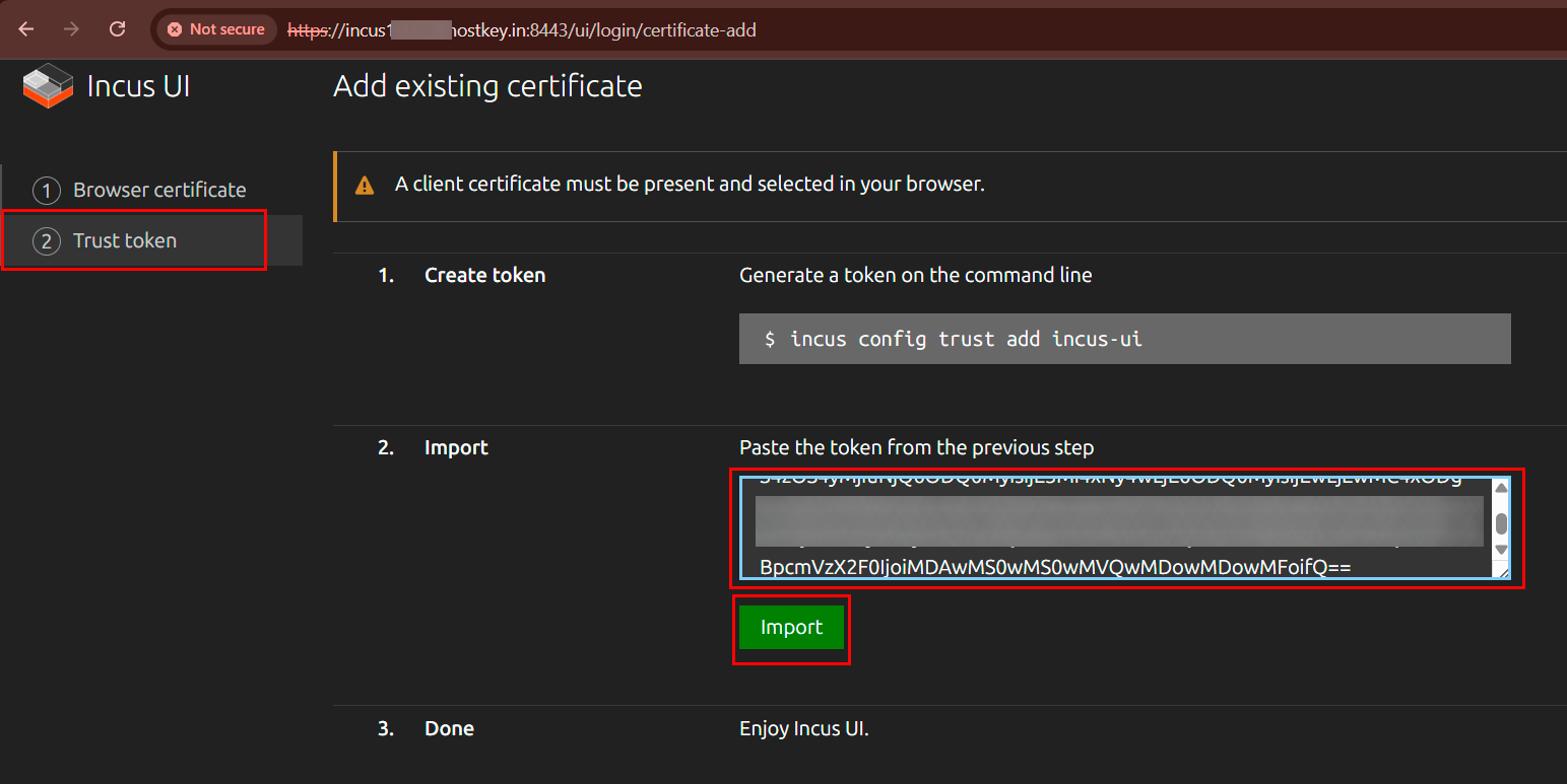 Le système vous redirigera vers la page pour ajouter un certificat existant :