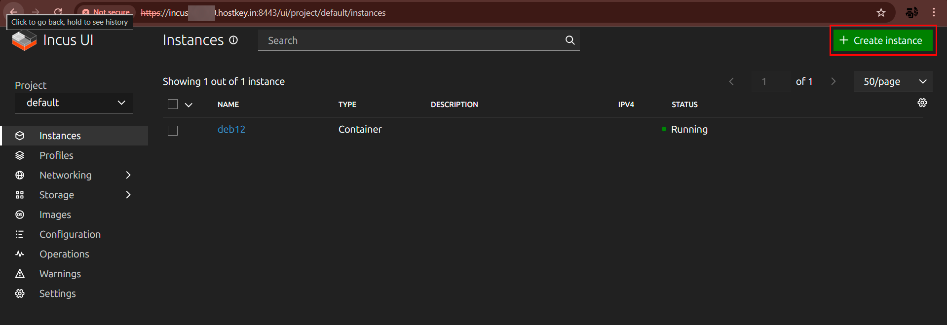Pour créer un nouveau conteneur, cliquez sur le bouton Create instance dans le coin supérieur droit de l'interface :