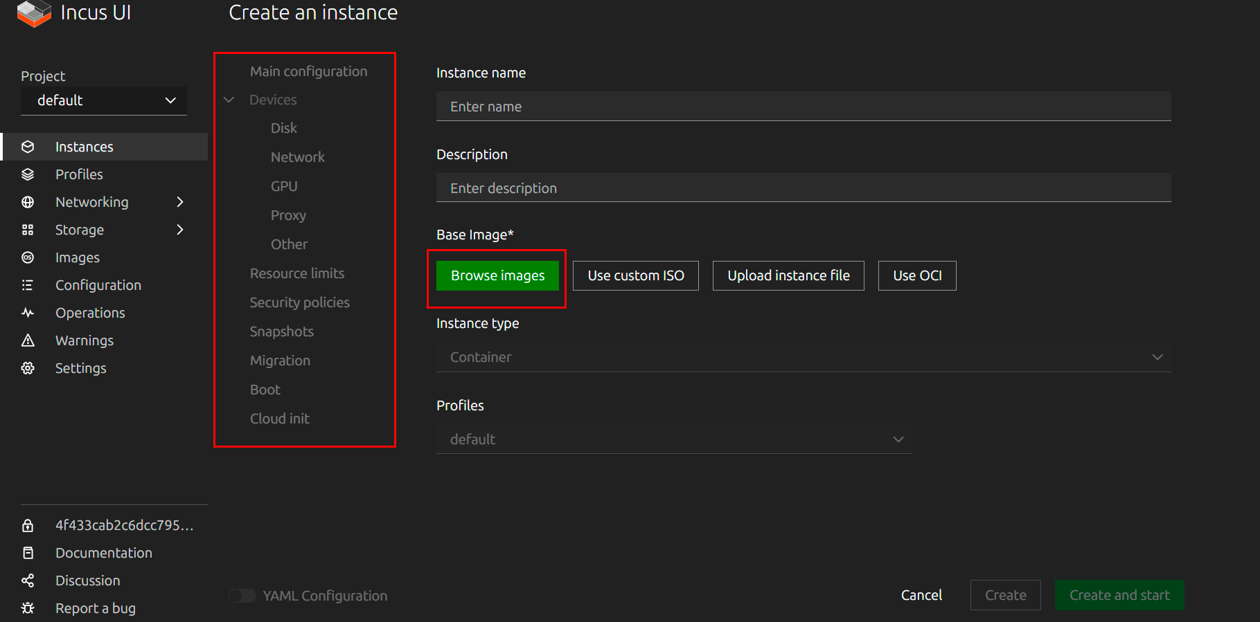 - Main configuration — paramètres de base du conteneur : nom, description, type d'instance (conteneur ou machine virtuelle), image de base et profils attribués ;