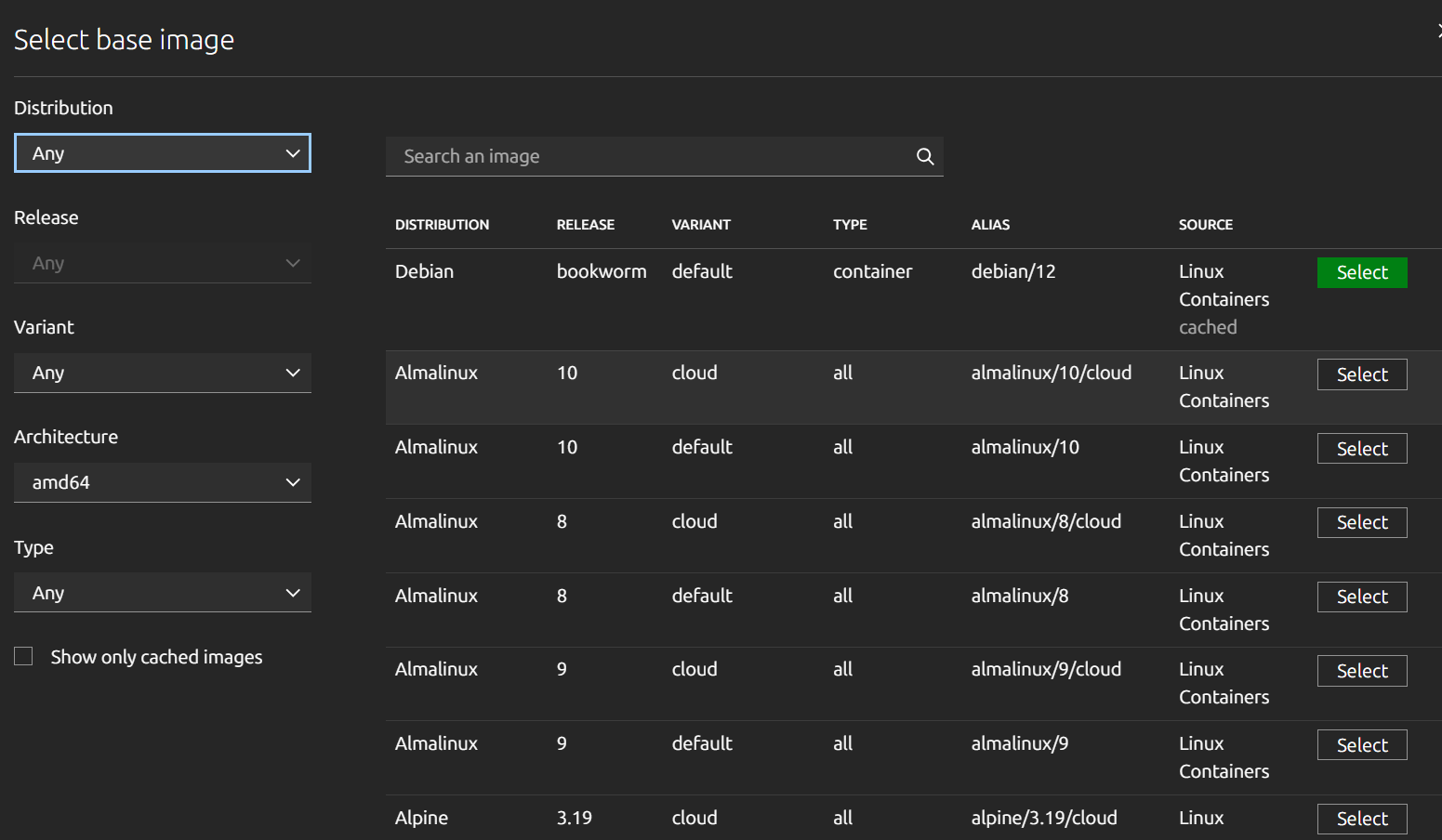 Un formulaire de création d'instance avec plusieurs sections de configuration s'ouvrira. Pour sélectionner une image de base, cliquez sur le bouton Browse images. Une fenêtre de sélection des images avec des filtres par distribution, version, variante, architecture et type s'ouvrira :