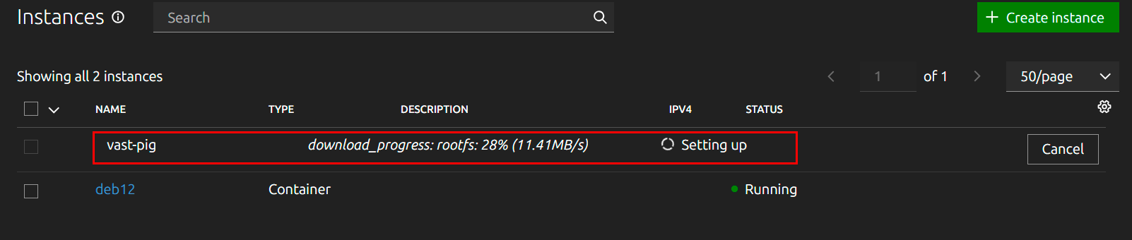 Pendant le déploiement du conteneur, le progrès de téléchargement de l'image est affiché. Le statut "Setting up" avec indication du progrès de téléchargement montre la progression actuelle de création de l'instance. Après installation terminée, le statut changera en "Running" avec un indicateur vert :