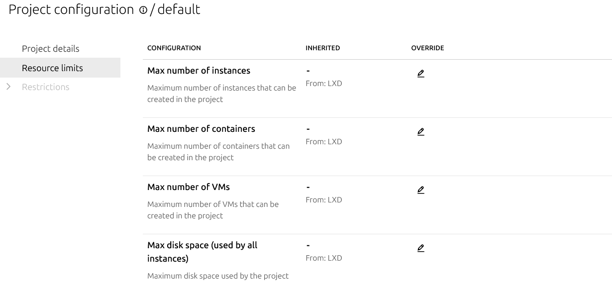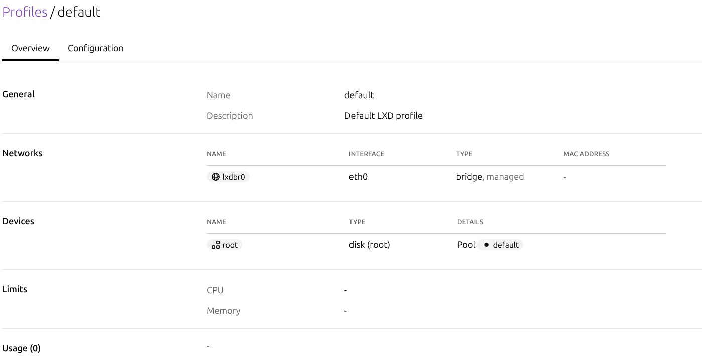 Le menu permet de configurer le serveur LXD au niveau de l'hôte, de gérer les certificats et les limites de ressources.