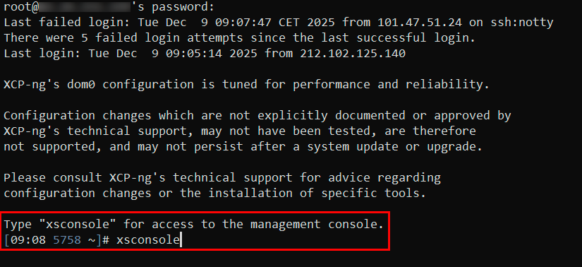 Entrez le mot de passe lorsque demandé. Après une connexion réussie, vous serez dans la ligne de commande XCP-ng.
