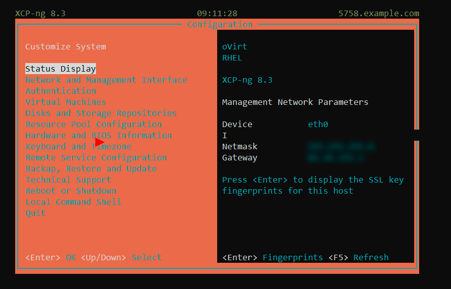 Lors de la connexion via SSH ou la console VNC, vous pouvez utiliser xsconsole - la console de gestion texte intégrée pour la configuration et l'administration de l'hôte XCP-ng.