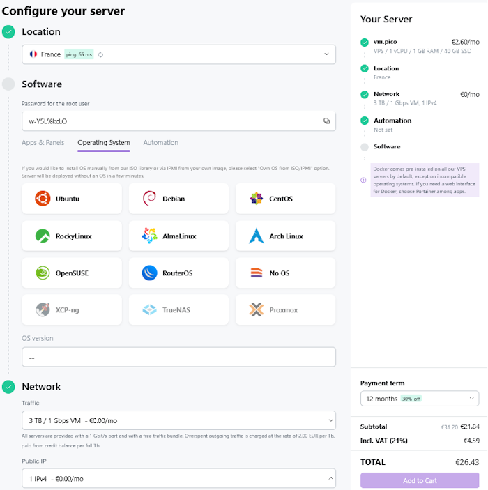 Si vous avez sélectionné un logiciel préinstallé depuis le Marketplace, il n'est pas nécessaire de choisir un système d'exploitation - nous sélectionnerons automatiquement l’option la plus adaptée pour l'installation.-