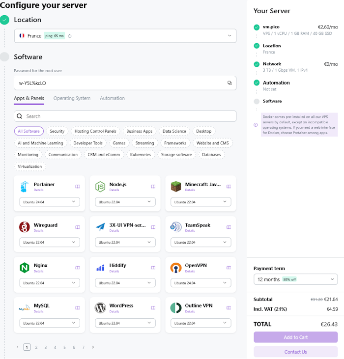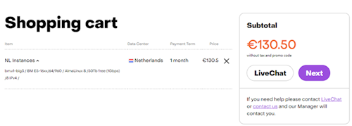 Après avoir terminé la configuration du serveur, cliquez sur Checkout. Vous serez redirigé vers l'onglet Cart. Ensuite, vérifiez les détails de la commande, cliquez sur Next et complétez l'enregistrement.