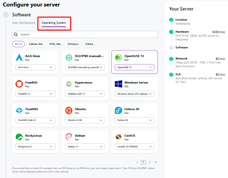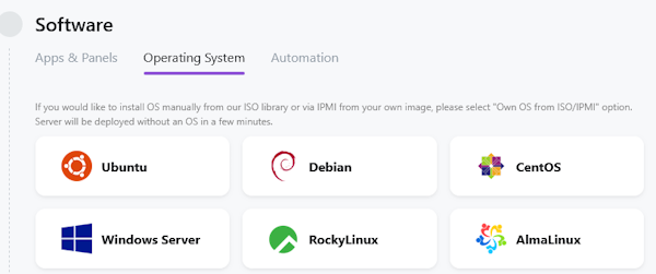 Si vous sélectionnez des logiciels préinstallés depuis le Marketplace, il n'est pas nécessaire de choisir un système d'exploitation - nous sélectionnerons automatiquement l'option la plus adaptée à l'installation.