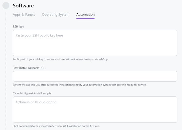 - Scripts cloud-init/post installation - des commandes qui seront exécutées lors du premier démarrage du serveur.