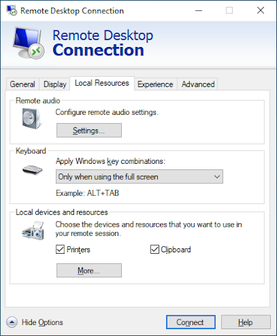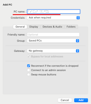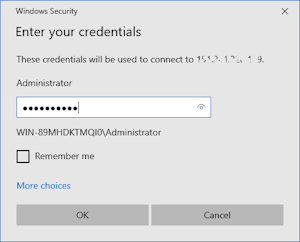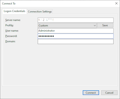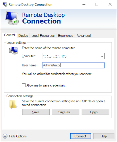 mstscc, puis appuyez sur Enter. - Dans la fenêtre Connect to Remote Desktop , dans le champ Computer , saisissez l'adresse IP du serveur.