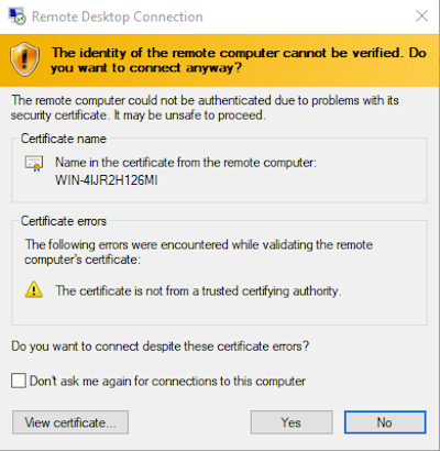 Lorsque vous vous connectez via RDP, presque tous les clients affichent une alerte concernant l'authentification du certificat de l'ordinateur distant. Cela est dû au fait que le certificat de sécurité est généré par un serveur séparé et n'est pas inclus dans la liste des certificats publiques de confiance. La situation ne présente aucun danger pour l'utilisateur, et lors de la connexion, vous devez accepter de poursuivre la session.