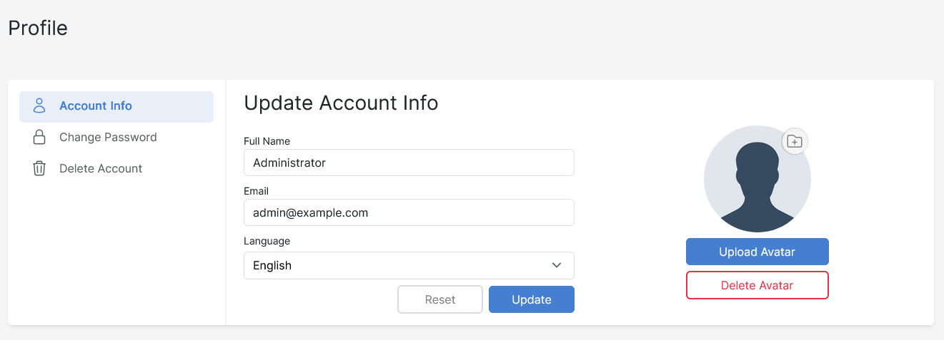 In this menu, you can manage Administrator account settings: