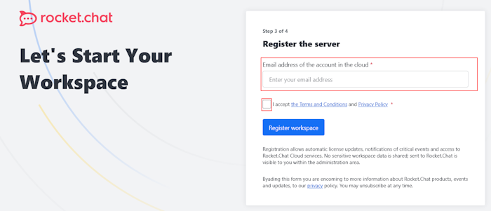 Once the registration procedure is completed, you will be transferred to the Rocket.Chat start menu: