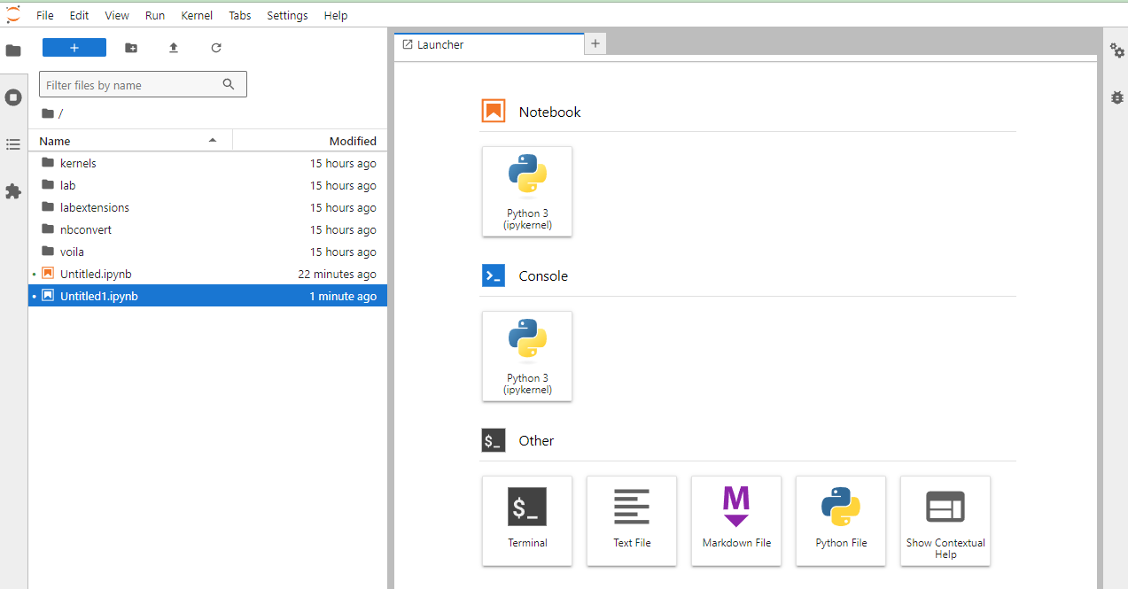 - Standard menu with options: File, Edit, View, Run, Kernel, Tabs, Settings, Help.