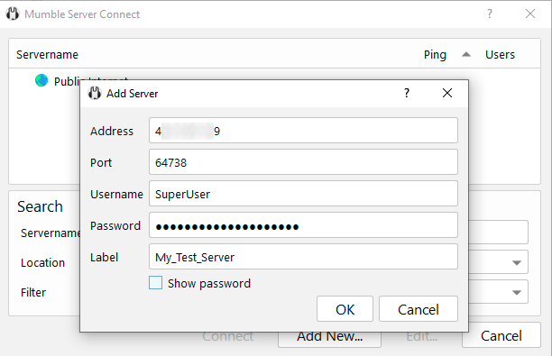 Add New...button; - Enter the IP address of the Mumble server in the Address field. The IP address of the server can be found in the server card in the Invapi panel in the Network tab: