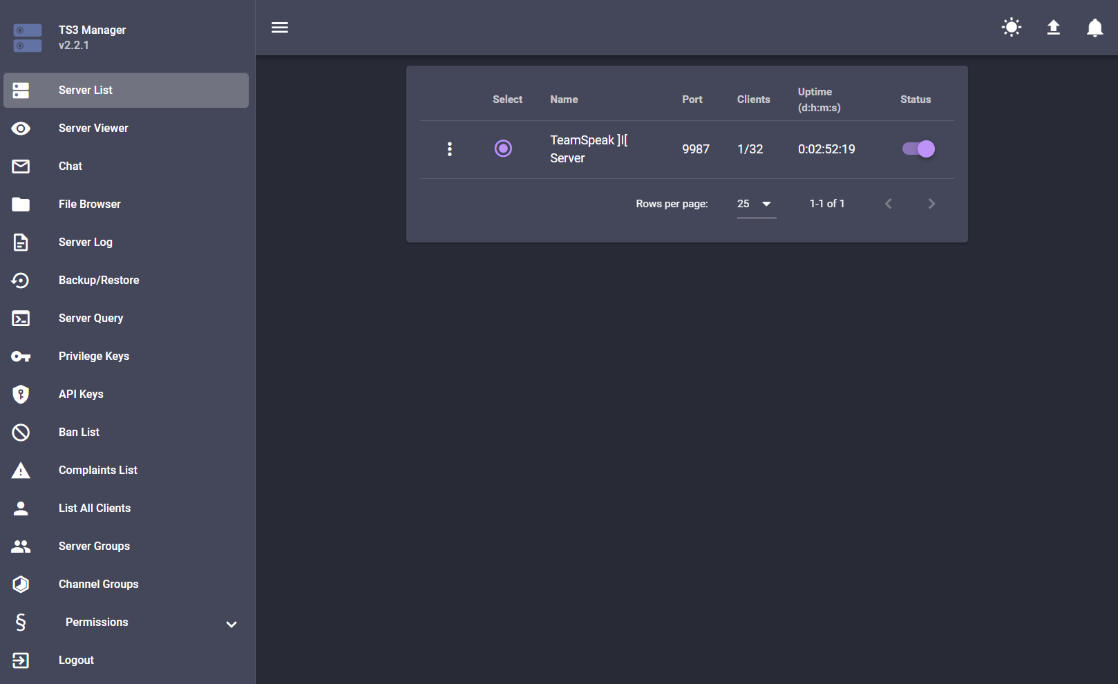 - Server List. This central management element displays all registered TeamSpeak 3 servers in the system. Administrators can view general information about each server, including its operational status, number of connected users, uptime, and used ports. Basic server management is performed through this interface: start, stop, restart, and basic parameter configuration.
