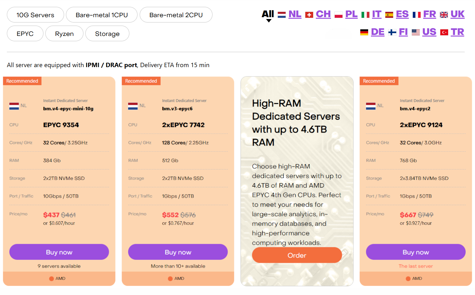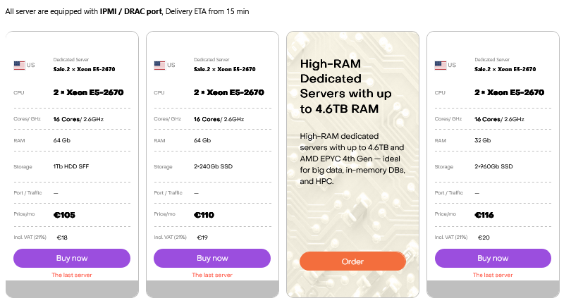Physical servers with fixed or custom characteristics. Ready configurations are available for immediate delivery (5–20 minutes).