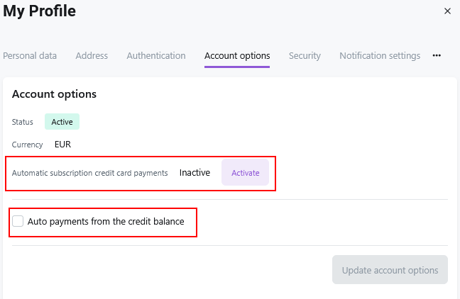 Otomatik ödeme seçeneğini, hesap ayarları bölümünde Username >> My profile >> Account options içinde de yönetebilirsiniz: