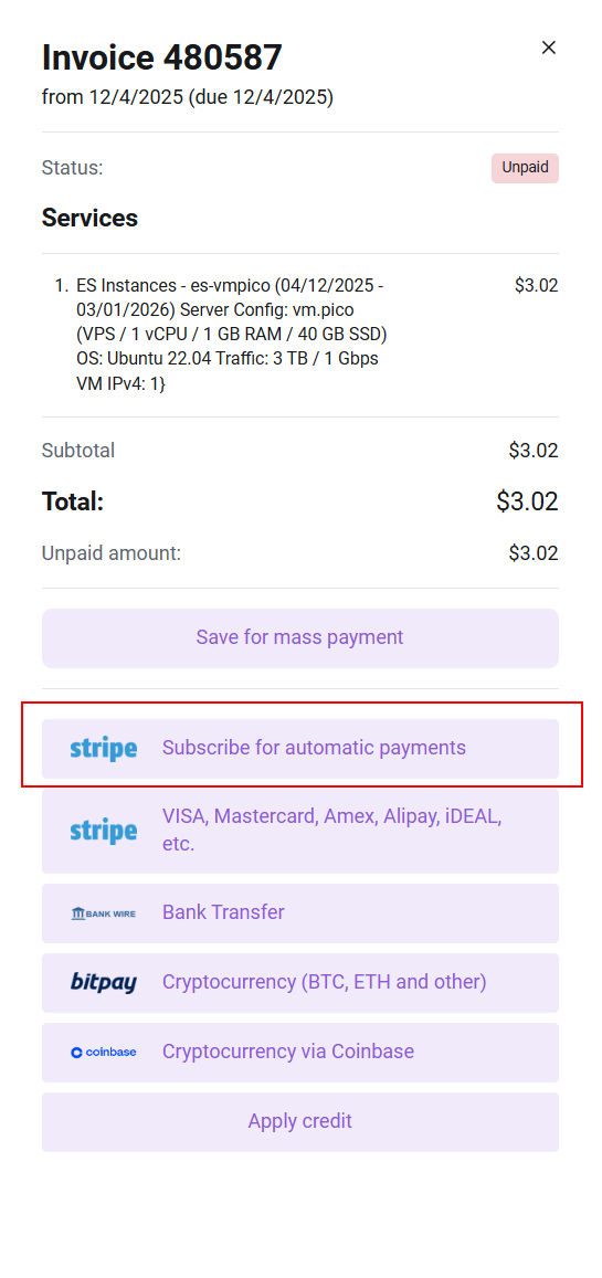 Fatura ödeme sırasında belirli bir ürün için otomatik ödeme ayarlayabilirsiniz. Bunu yapmak için, sipariş verirken fatura içinde Set up auto‑payment for services using a bank card ödeme yöntemini seçin.