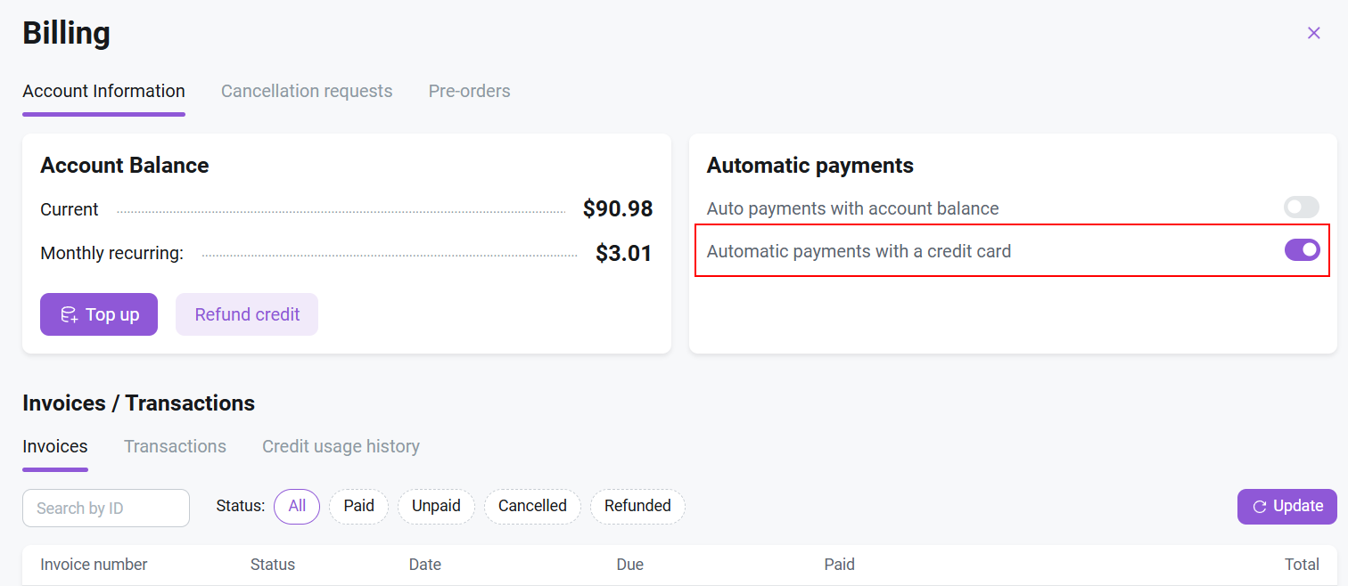Hesap için otomatik ödemeyi etkinleştirmek için Billing sekmesine gidin ve Automatic payments from bank card anahtarını açın.