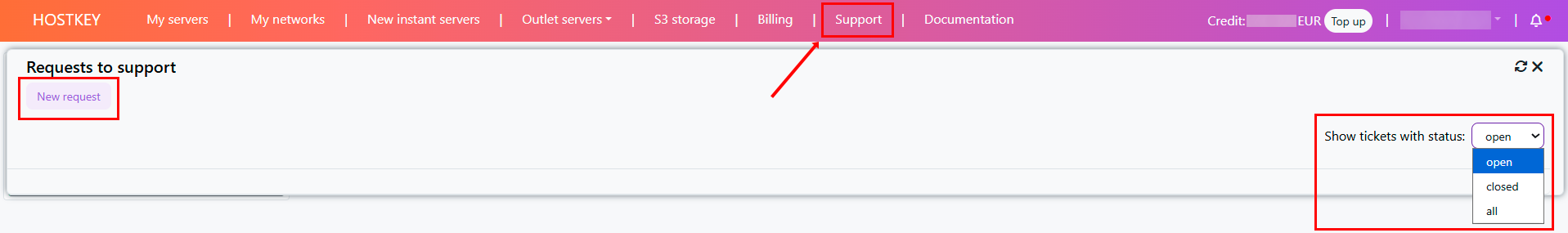 Sayfanın üst kısmında destek taleplerinin bir listesi görüntülenir. Çalışma kolaylığı için Show tickets with status: menüsünde duruma göre talep filtreleme sağlanmıştır: