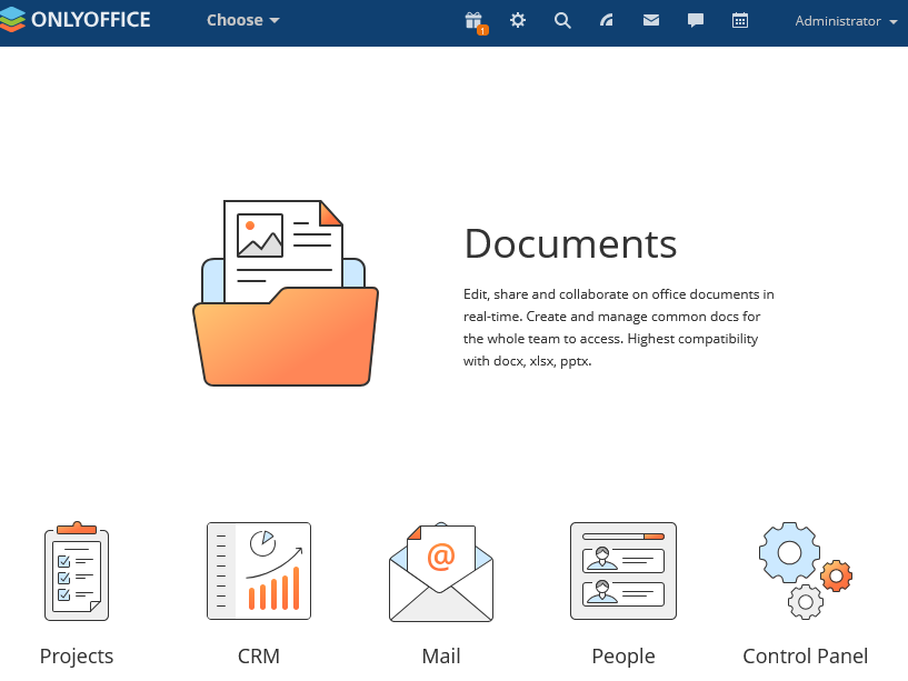Yönetici hesabını kaydettikten sonra, ONLYOFFICE Workspace başlangıç ekranına yönlendirileceksiniz. Bu ekranı kullanarak platform elemanları arasında gezinebilirsiniz.