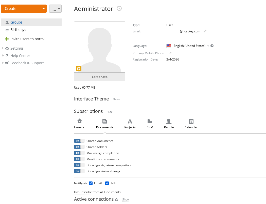 Ekranın sağ üst köşesinde Administrator profilinin üzerine tıklayın ve Profile menüsünü seçin. Yönetici hesabı ayarları penceresi açılacaktır. Temel kullanıcı ayarlarını değiştirebilirsiniz: E-posta, dil, telefon numarası, fotoğraf ekleme, arayüz teması seçimi - koyu veya açık. Bu pencereyi kullanarak bildirim teslim yöntemlerini yapılandırabilir ve almak istediğiniz bildirim gruplarını seçebilirsiniz.