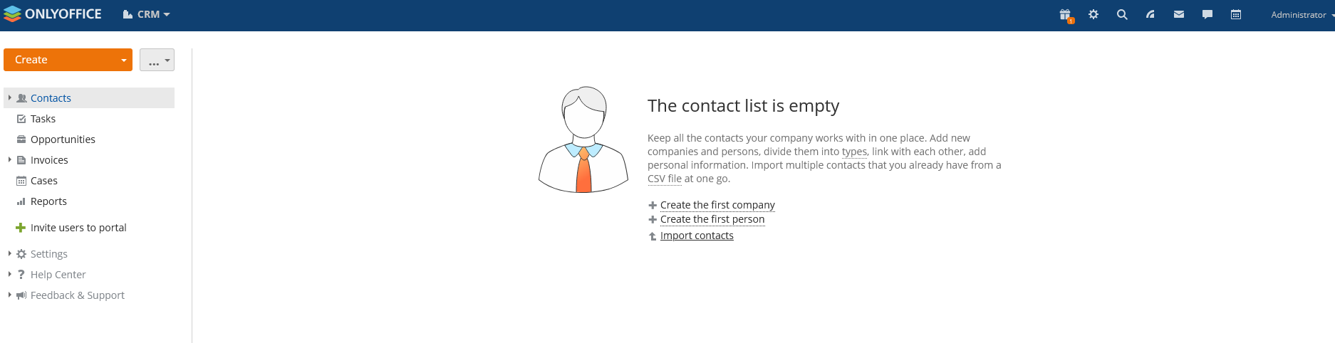 Bu bölüm müşteri ilişkilerini yönetir. Kişiler ve şirketler veritabanı oluşturabilir, müşteriler için görevler ve hatırlatmalar ayarlayabilirsiniz. E-posta ve takvim ile entegrasyon desteklenir.