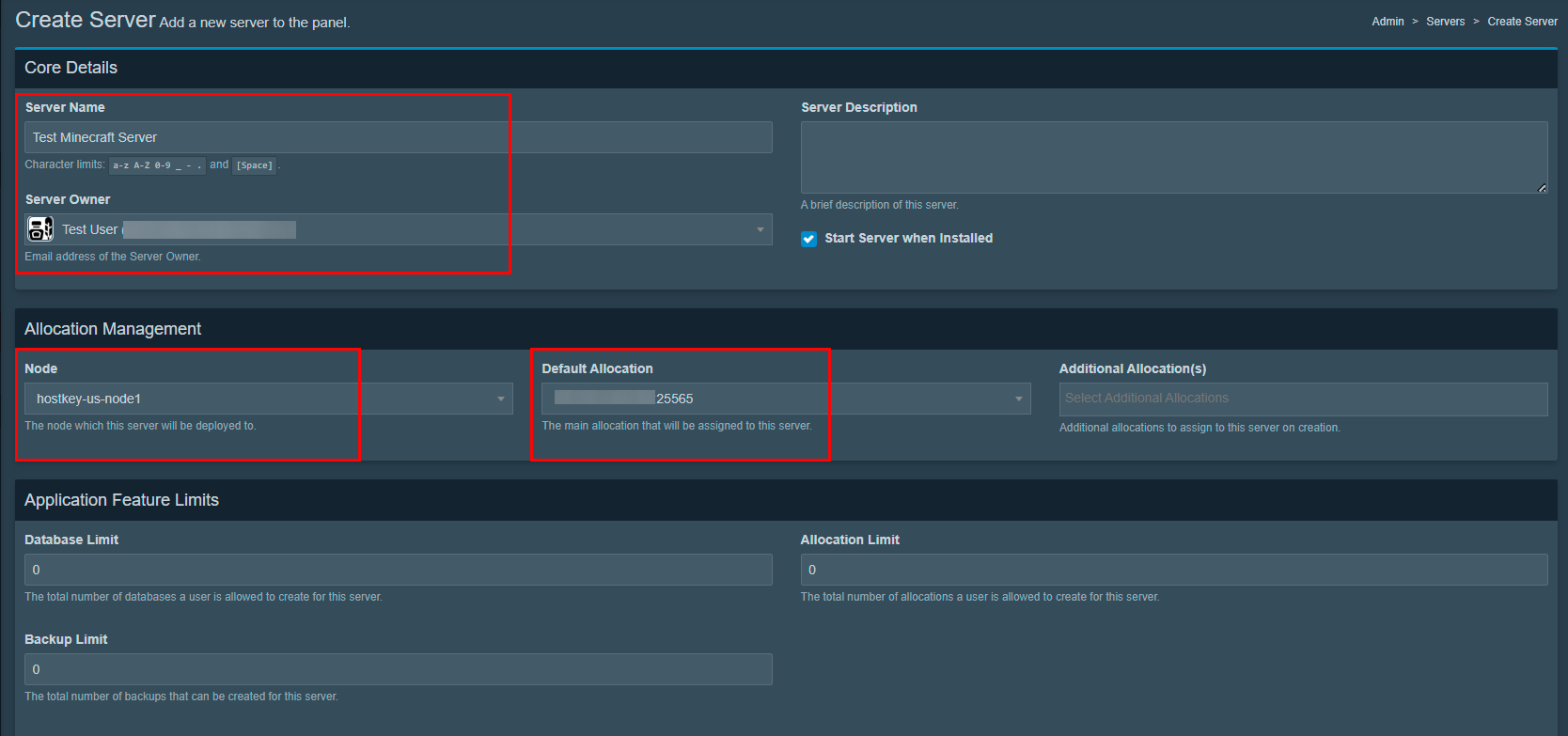 Test Minecraft Server); - Server Owner: listeden sahibi kullanıcıyı seçin;