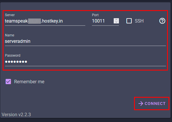 Yerel cihazınızda TeamSpeak istemcisini başlattıktan sonra, alttaki ekran görüntüsünde belirtilen alana sunucunun IP adresini girin ve Connect düğmesine tıklayın: