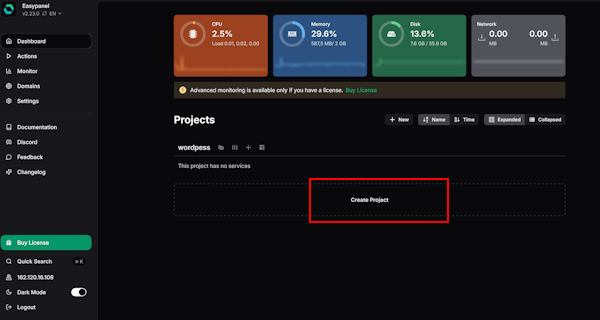 EasyPanel'a oturum açtığınızda kullanıcılar, ana Dashboard menüsüne erişebilir: