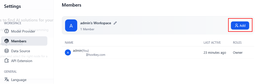 Adddüğmesine tıklayın, e-postayı girin ve davet otomatik olarak gönderilecektir; - Model Provider ekleyin;