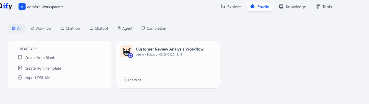 Tüm AI uygulamalarınızı (sohbet robotları, ajanlar, iş akışları) yönetmek için merkezi bölüm. Uygulamaları oluşturmak ve düzenlemek için görsel sürükle-bırak oluşturucusudur.