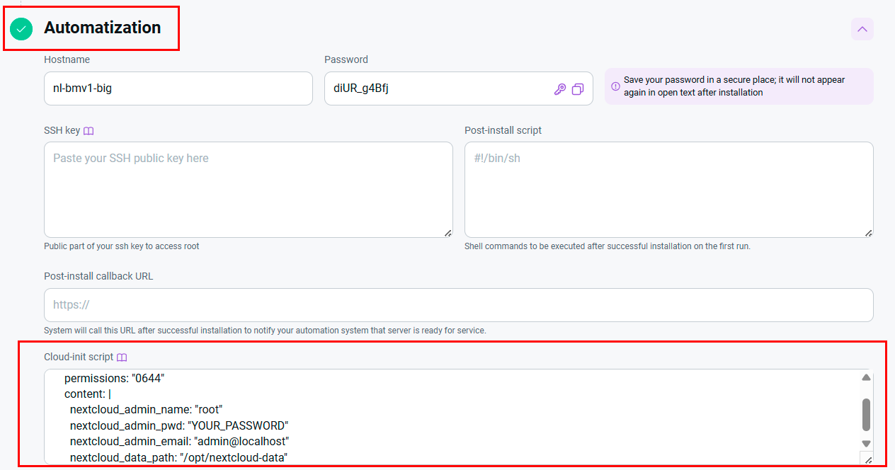 Nextcloud ile sunucu sipariş ederken, sipariş sürecinde Automatization aşamasında cloud-init yapılandırması kullanarak ana kurulum parametrelerini önceden ayarlayabilirsiniz. Bu, yönetici kimlik bilgilerini, e-postayı ve veri depolama yolunu otomatik olarak ayarlamanızı sağlar: