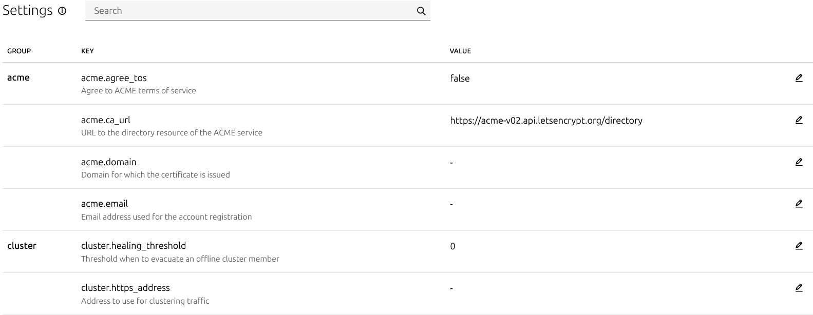 Menü, küresel sunucu parametrelerini ve web arayüzünün kendisini yapılandırmak için kullanılır. Birkaç alt kategoriye ayrılmıştır (acme, core, cluster vb.).