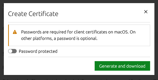 Şifre korumalı veya korumasız sertifika oluşturabilirsiniz (macOS için Şifre koruması zorunludur).