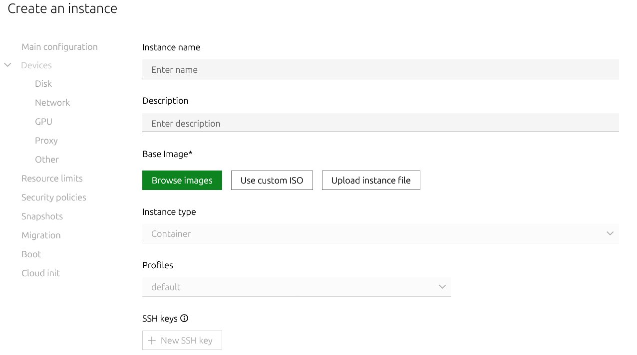 Menü, LXD sunucusunu ana bilgisayar düzeyinde yapılandırmanızı, sertifikaları ve kaynak sınırlarını yönetmenizi sağlar.