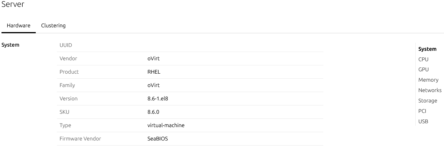 Bu menü, sistem donanımı (CPU, GPU, bellek, portlar) ve sunucu durumu hakkında bilgi gösterir; ayrıca küme bilgisi (kümeleme varsa) sunar.