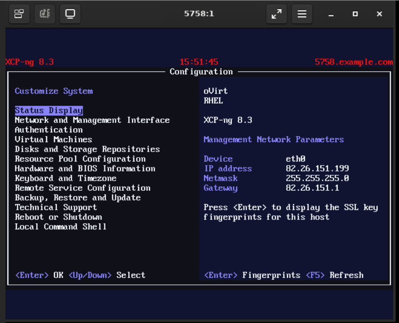 SSH veya VNC konsolu üzerinden bağlanırken, XCP-ng yapılandırması ve ana bilgisayar yönetimi için yerleşik metin yönetim konsolu olan xsconsole'u kullanabilirsiniz.