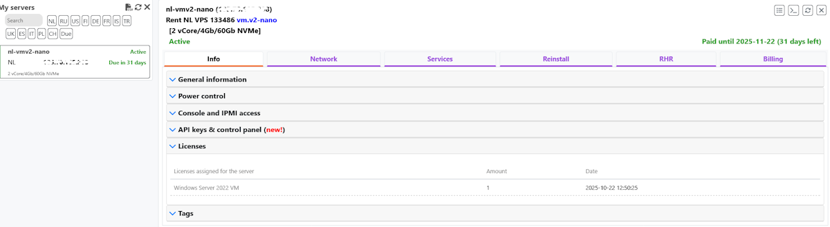 - Your Account adresinde HostKey web sitesine giriş yapın.